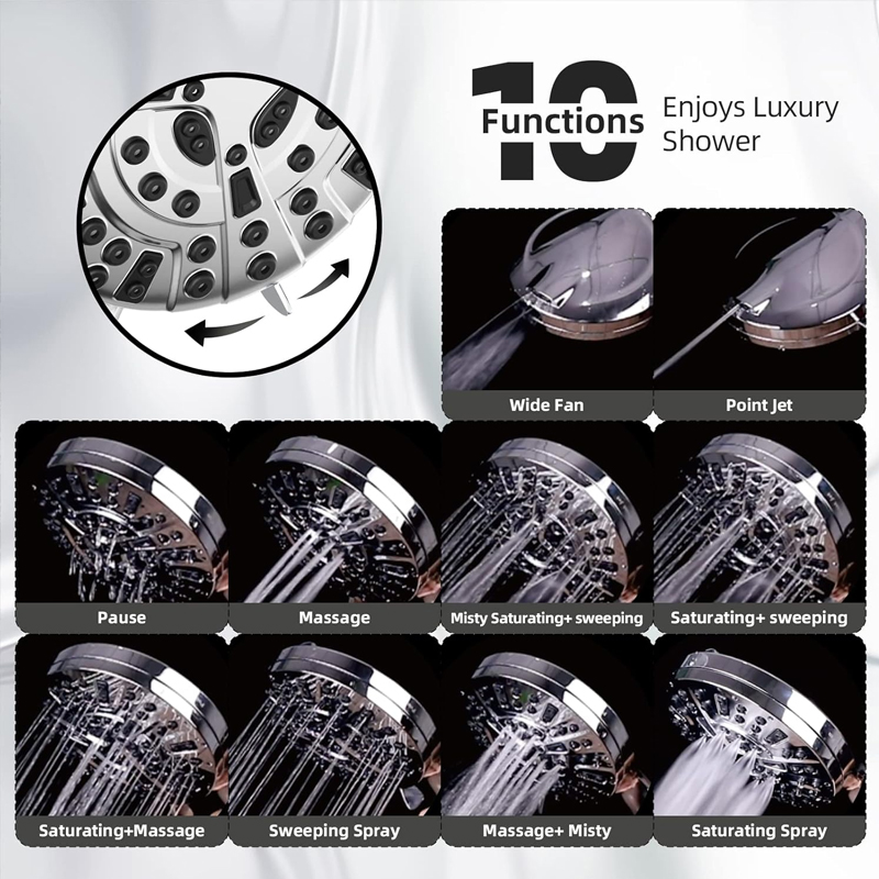Cabezal de ducha de alta presión con 10 funciones, modo de pausa integrado y 2 boquillas Power Wash, cabezal de ducha manual de alto flujo que no se obstruyen, manguera a prueba de fugas de 6.5 pies y soporte de metal.