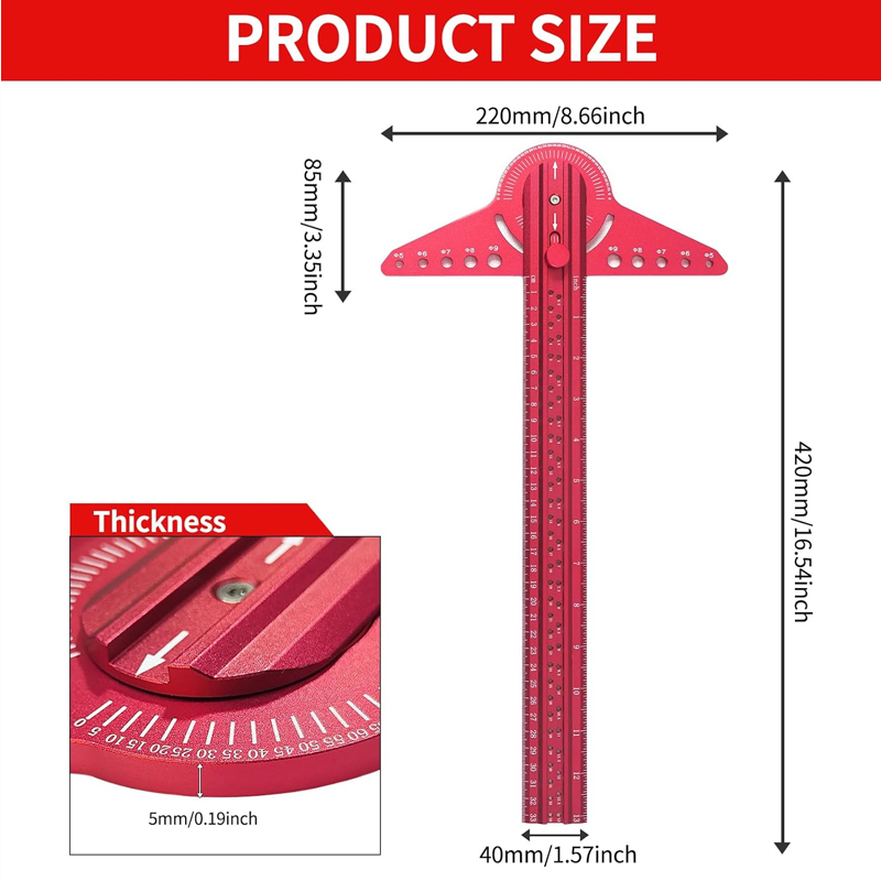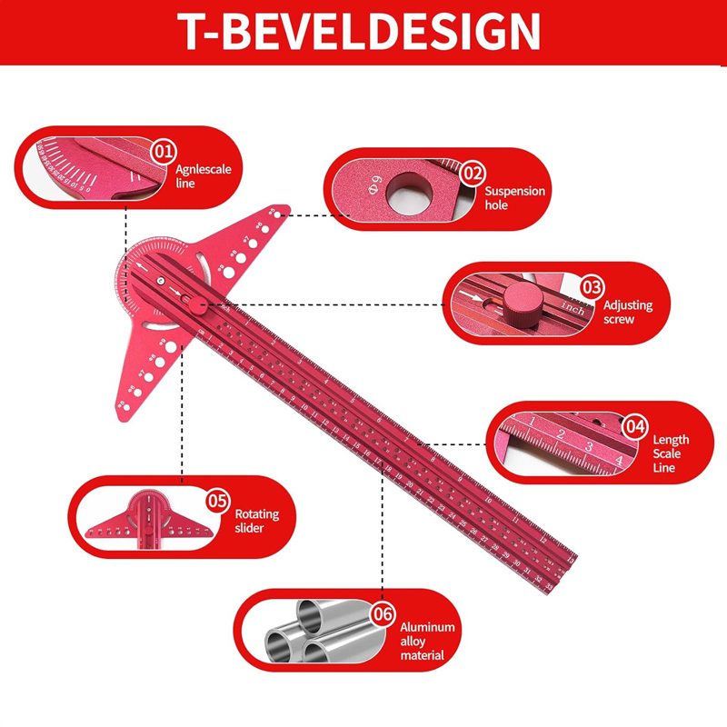Trazado de ángulos de ajuste rápido: Cuenta con un exclusivo buscador de ángulos ajustable: simplemente desenrosque la tuerca de bloqueo para configurar ángulos personalizados y vuelva a apretarla para un marcado preciso. Esta flexibilidad permite cambiar rápidamente entre mediciones, garantizando la precisión en biseles, ingletes y diseños radiales sin necesidad de herramientas adicionales.