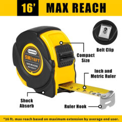 Acerca de este artículo Cinta métrica retráctil de 5 m (16 pies) para todas sus necesidades: Perfecta tanto para uso personal como profesional, esta cinta métrica ofrece versatilidad y comodidad para una amplia gama de tareas de medición. Carcasa de goma resistente: El revestimiento de goma resistente ofrece una excepcional absorción de impactos y un…